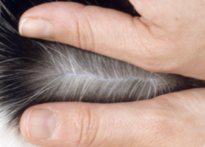 • Maak een scheiding in de vacht/haren op de nek van uw kat (tussen het hoofd en de schouders) dusdanig dat u de ‘blote’ huid duidelijk kunt zien.